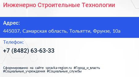 Инженерно-Строительные Технологии по адресу 445037, Самарская область, Тольятти, Фрунзе, 10а в дальнейшем Организация, размещена в следующих категориях: