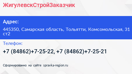 ЖигулевскСтройЗаказчик по адресу 445350, Самарская область, Тольятти, Комсомольская, 31 ст2 в дальнейшем Организация, размещена в следующих категориях: