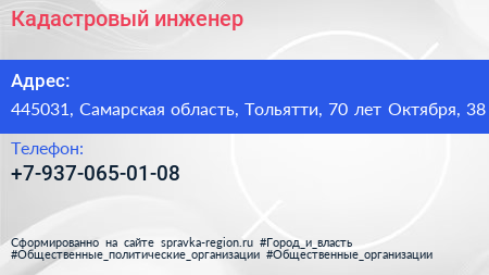 Кадастровый инженер по адресу 445031, Самарская область, Тольятти, 70 лет Октября, 38 в дальнейшем Организация, размещена в следующих категориях: