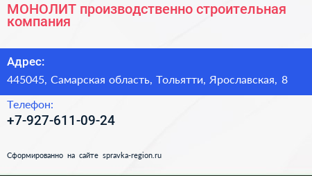МОНОЛИТ, производственно-строительная компания по адресу 445045, Самарская область, Тольятти, Ярославская, 8 в дальнейшем Организация, размещена в следующих категориях: