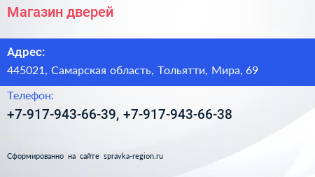 Магазин дверей по адресу 445021, Самарская область, Тольятти, Мира, 69 в дальнейшем Организация, размещена в следующих категориях: