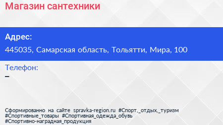 Магазин сантехники по адресу 445035, Самарская область, Тольятти, Мира, 100 в дальнейшем Организация, размещена в следующих категориях: