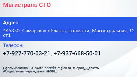 Магистраль, СТО по адресу 445350, Самарская область, Тольятти, Магистральная, 12 ст1 в дальнейшем Организация, размещена в следующих категориях: