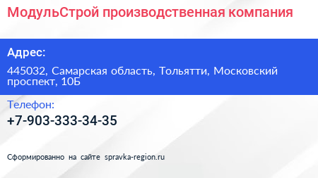 МодульСтрой, производственная компания по адресу 445032, Самарская область, Тольятти, Московский проспект, 10Б в дальнейшем Организация, размещена в следующих категориях: