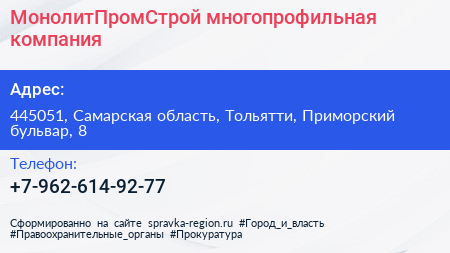 МонолитПромСтрой, многопрофильная компания по адресу 445051, Самарская область, Тольятти, Приморский бульвар, 8 в дальнейшем Организация, размещена в следующих категориях: