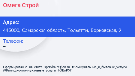 Омега Строй по адресу 445000, Самарская область, Тольятти, Борковская, 9 в дальнейшем Организация, размещена в следующих категориях: