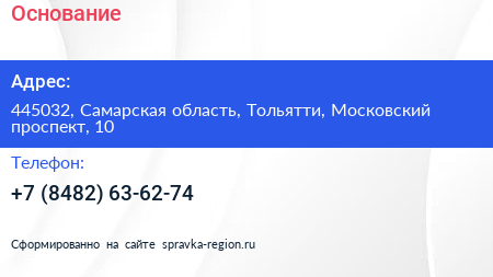 Основание по адресу 445032, Самарская область, Тольятти, Московский проспект, 10 в дальнейшем Организация, размещена в следующих категориях:
