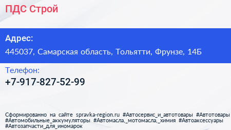 ПДС-Строй по адресу 445037, Самарская область, Тольятти, Фрунзе, 14Б в дальнейшем Организация, размещена в следующих категориях: