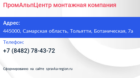 ПромАльпЦентр, монтажная компания по адресу 445000, Самарская область, Тольятти, Ботаническая, 7а в дальнейшем Организация, размещена в следующих категориях: