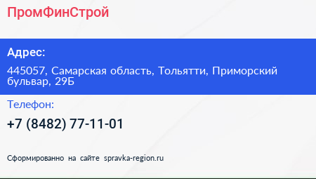 ПромФинСтрой по адресу 445057, Самарская область, Тольятти, Приморский бульвар, 29Б в дальнейшем Организация, размещена в следующих категориях: