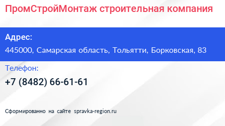 ПромСтройМонтаж, строительная компания по адресу 445000, Самарская область, Тольятти, Борковская, 83 в дальнейшем Организация, размещена в следующих категориях: