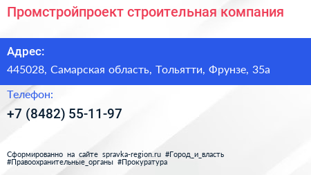 Промстройпроект, строительная компания по адресу 445028, Самарская область, Тольятти, Фрунзе, 35а в дальнейшем Организация, размещена в следующих категориях: