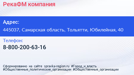 РекаФМ, компания по адресу 445037, Самарская область, Тольятти, Юбилейная, 40 в дальнейшем Организация, размещена в следующих категориях: