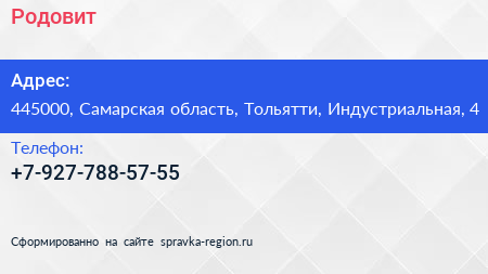 Родовит по адресу 445000, Самарская область, Тольятти, Индустриальная, 4 в дальнейшем Организация, размещена в следующих категориях: