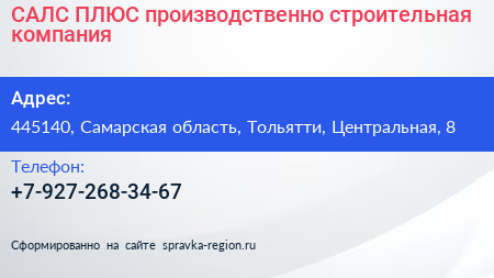 САЛС ПЛЮС, производственно-строительная компания по адресу 445140, Самарская область, Тольятти, Центральная, 8 в дальнейшем Организация, размещена в следующих категориях: