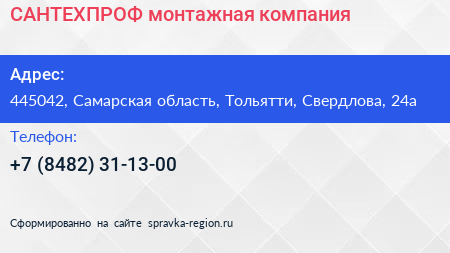 САНТЕХПРОФ, монтажная компания по адресу 445042, Самарская область, Тольятти, Свердлова, 24а в дальнейшем Организация, размещена в следующих категориях: