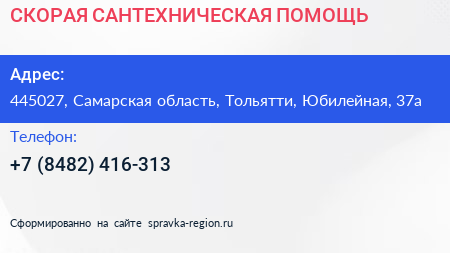 СКОРАЯ САНТЕХНИЧЕСКАЯ ПОМОЩЬ по адресу 445027, Самарская область, Тольятти, Юбилейная, 37а в дальнейшем Организация, размещена в следующих категориях: