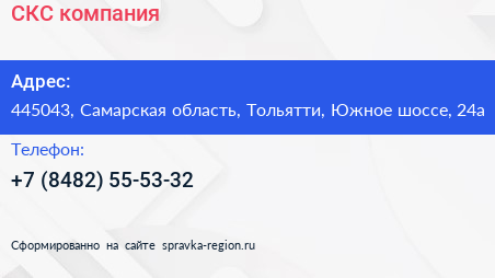 СКС, компания по адресу 445043, Самарская область, Тольятти, Южное шоссе, 24а в дальнейшем Организация, размещена в следующих категориях: