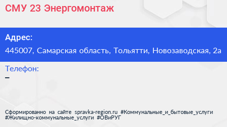 СМУ 23 Энергомонтаж по адресу 445007, Самарская область, Тольятти, Новозаводская, 2а в дальнейшем Организация, размещена в следующих категориях: