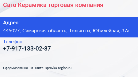 Саго Керамика, торговая компания по адресу 445027, Самарская область, Тольятти, Юбилейная, 37а в дальнейшем Организация, размещена в следующих категориях: