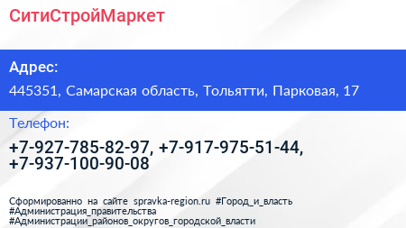 СитиСтройМаркет по адресу 445351, Самарская область, Тольятти, Парковая, 17 в дальнейшем Организация, размещена в следующих категориях: