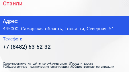Стэнли по адресу 445000, Самарская область, Тольятти, Северная, 51 в дальнейшем Организация, размещена в следующих категориях: