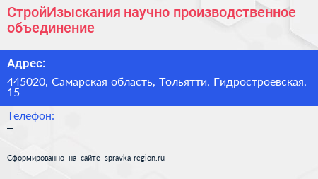 СтройИзыскания, научно-производственное объединение по адресу 445020, Самарская область, Тольятти, Гидростроевская, 15 в дальнейшем Организация, размещена в следующих категориях: