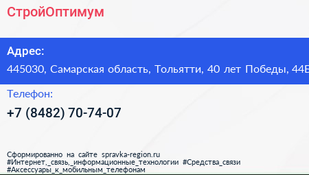 СтройОптимум по адресу 445030, Самарская область, Тольятти, 40 лет Победы, 44Б в дальнейшем Организация, размещена в следующих категориях: