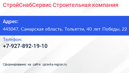СтройСнабСервис, Строительная компания по адресу 445047, Самарская область, Тольятти, 40 лет Победы, 22 в дальнейшем Организация, размещена в следующих категориях: