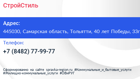 СтройСтиль по адресу 445030, Самарская область, Тольятти, 40 лет Победы, 33г в дальнейшем Организация, размещена в следующих категориях: