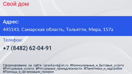 Свой дом по адресу 445143, Самарская область, Тольятти, Мира, 157а в дальнейшем Организация, размещена в следующих категориях: