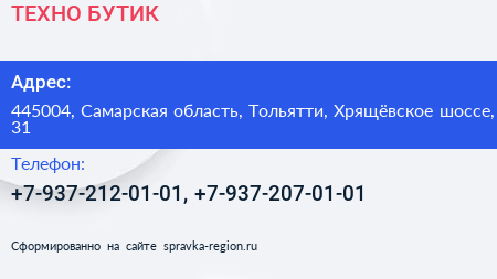 ТЕХНО БУТИК по адресу 445004, Самарская область, Тольятти, Хрящёвское шоссе, 31 в дальнейшем Организация, размещена в следующих категориях: