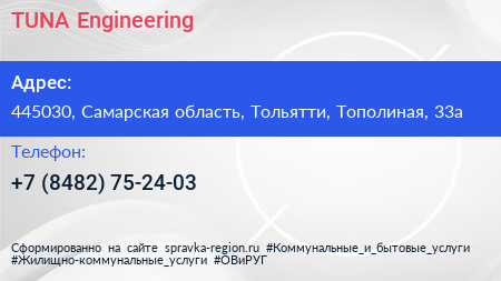 TUNA Engineering по адресу 445030, Самарская область, Тольятти, Тополиная, 33а в дальнейшем Организация, размещена в следующих категориях: