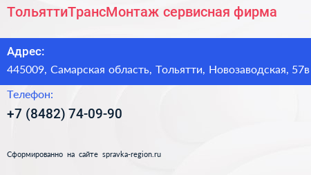 ТольяттиТрансМонтаж, сервисная фирма по адресу 445009, Самарская область, Тольятти, Новозаводская, 57в в дальнейшем Организация, размещена в следующих категориях: