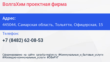 ВолгаХим, проектная фирма по адресу 445044, Самарская область, Тольятти, Офицерская, 15 в дальнейшем Организация, размещена в следующих категориях: