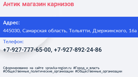 Антик, магазин карнизов по адресу 445030, Самарская область, Тольятти, Дзержинского, 16а в дальнейшем Организация, размещена в следующих категориях:
