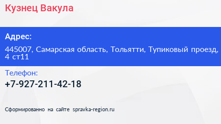 Кузнец Вакула по адресу 445007, Самарская область, Тольятти, Тупиковый проезд, 4 ст11 в дальнейшем Организация, размещена в следующих категориях: