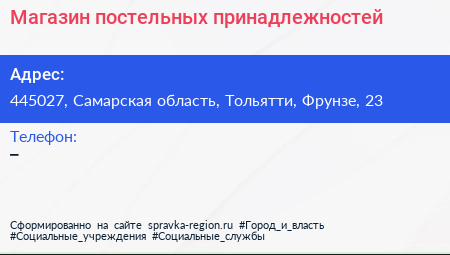 Магазин постельных принадлежностей по адресу 445027, Самарская область, Тольятти, Фрунзе, 23 в дальнейшем Организация, размещена в следующих категориях: