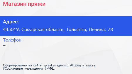 Магазин пряжи по адресу 445019, Самарская область, Тольятти, Ленина, 73 в дальнейшем Организация, размещена в следующих категориях: