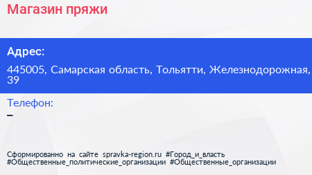 Магазин пряжи по адресу 445005, Самарская область, Тольятти, Железнодорожная, 39 в дальнейшем Организация, размещена в следующих категориях: