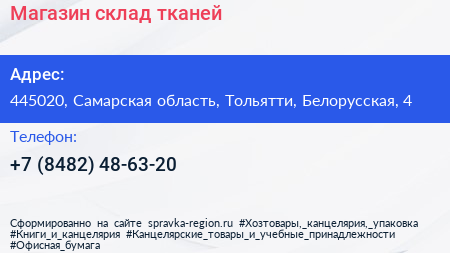 Магазин-склад тканей по адресу 445020, Самарская область, Тольятти, Белорусская, 4 в дальнейшем Организация, размещена в следующих категориях: