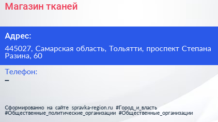 Магазин тканей по адресу 445027, Самарская область, Тольятти, проспект Степана Разина, 60 в дальнейшем Организация, размещена в следующих категориях: