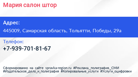 Мария, салон штор по адресу 445009, Самарская область, Тольятти, Победы, 29а в дальнейшем Организация, размещена в следующих категориях: