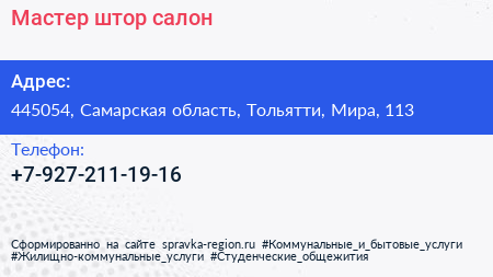 Мастер штор, салон по адресу 445054, Самарская область, Тольятти, Мира, 113 в дальнейшем Организация, размещена в следующих категориях: