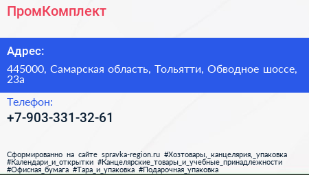 ПромКомплект по адресу 445000, Самарская область, Тольятти, Обводное шоссе, 23а в дальнейшем Организация, размещена в следующих категориях: