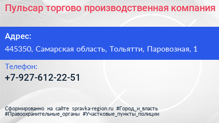 Пульсар, торгово-производственная компания по адресу 445350, Самарская область, Тольятти, Паровозная, 1 в дальнейшем Организация, размещена в следующих категориях: