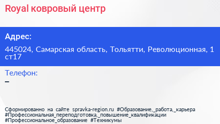 Royal, ковровый центр по адресу 445024, Самарская область, Тольятти, Революционная, 1 ст17 в дальнейшем Организация, размещена в следующих категориях: