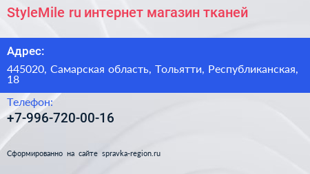 StyleMile.ru, интернет-магазин тканей по адресу 445020, Самарская область, Тольятти, Республиканская, 18 в дальнейшем Организация, размещена в следующих категориях: