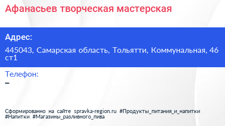 Афанасьев, творческая мастерская по адресу 445043, Самарская область, Тольятти, Коммунальная, 46 ст1 в дальнейшем Организация, размещена в следующих категориях: