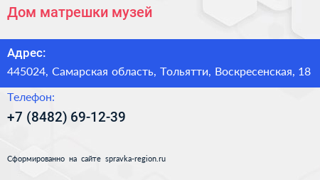 Дом матрешки, музей по адресу 445024, Самарская область, Тольятти, Воскресенская, 18 в дальнейшем Организация, размещена в следующих категориях: